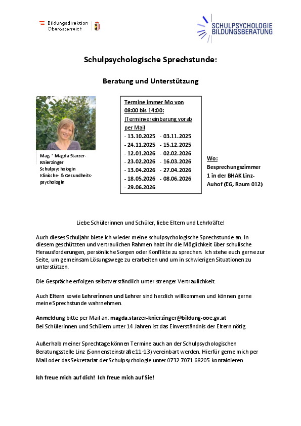 Außerhalb meiner Sprechtage können Termine auch an der Schulpsychologischen Beratungsstelle Linz (Sonnensteinstraße 11-13) vereinbart werden. Hierfür gerne mich per Mail oder das Sekretariat der Schulpsychologie unter 0732 7071 68205 kontaktieren.